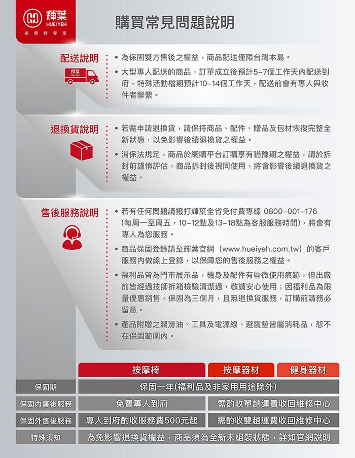 按摩椅屬於大型商品,預購日(不含)最快5日後到貨,最晚到貨日前三日會有專人進行約裝動作。離島尚無配送服務,有特殊需求需配送外島,會額外收取配送費用。詳細狀況請洽客服專線:0800-001-176
