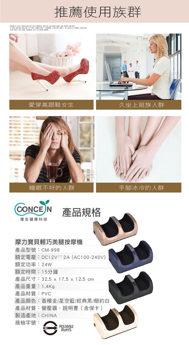 | 【內容物】 | 美腿按摩機x1、變壓器x1、說明書(含保固卡)x1 |