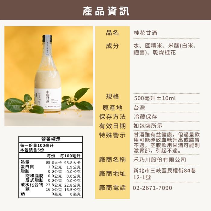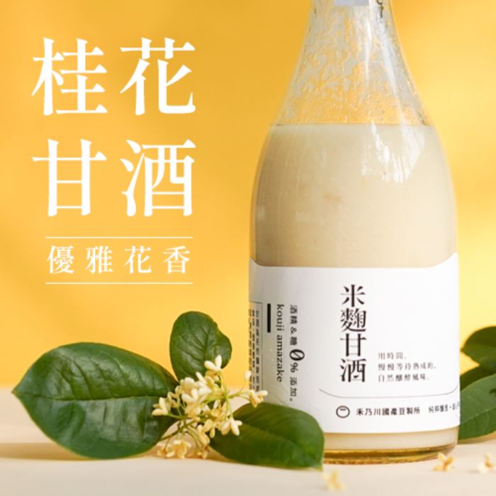 嚴選苗栗南庄四季桂花,經由手工細心摘採,透過日曬完整保留花朵的色澤與香氣,再與禾乃川自製米麴用時間慢慢釀酵,呈現淡雅的鵝黃色!桂花的優雅清香,搭配米粒圓潤飽滿且細緻的口感,在口中成就迷人順口的花系列養生甘酒飲品!