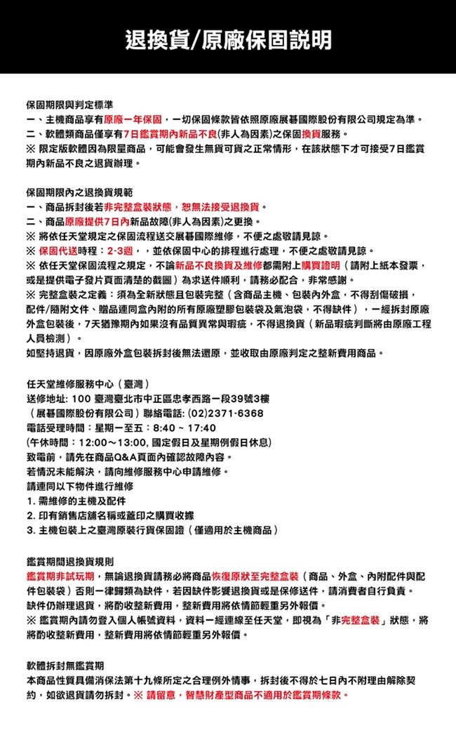 | 【保固說明】 | 一、本產品享有原廠一年保固,一切保固條款與狀況判定標準皆依照原廠展碁國際股份有限公司規定為準。 二、本商品拆封後若非完整狀態,恕無法接受退換貨。 三、本商品原廠提供7日內新品故障(非人為因素)之換貨。 ※將依任天堂規定之保固流程送交展碁國際維修,不便之處敬請見諒。 ※重要:商品經拆封即不可退貨,任何送件保固維修、換貨皆須保留『完整盒裝:主產品及所有配件,連同所有原廠包裝袋』必須保持完整、齊全不得缺件損壞。 ※由我司代送保固流程約要跑2-3週,並依保固中心的排程進行處理,不便之處敬請見諒。 ※依任天堂規定之保固流程,不論新品不良的換貨或維修都需附上購買證明(請附上紙本發票,或是提供電子發票頁面清楚的截圖),並建議預錄開箱影片,以維護自身權益,為求送件順利,請務必配合,非常感謝。 |