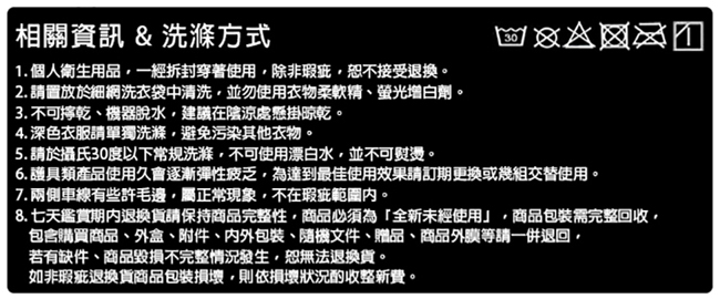 | 【注意事項或使用方法】 | 注意事項: 1.個人衛生用品,一經拆封穿著使用,除非瑕疵,恕不接受退換。 2.請置放於細網洗衣袋中清洗,並勿使用衣物柔軟精、螢光增白劑 3.不可擰乾、機器脫水,建議在陰涼處懸掛晾乾 4.深色衣服請單獨洗滌,避免污染其他衣物 5.請於攝氏30度以下常規洗滌,不可使用漂白水,並不可熨燙。 6.護具類產品使用久會逐漸彈性疲乏,為達到最佳使用效果請訂期更換或幾組交替使用。 7.鑑賞期內退換貨請保持商品完整性,商品必須為『全新未經使用』,商品包裝需完整回收,包含購買商品、外盒、附件、內外包裝、隨機文件、贈品、商品外膜等請一併退回,若有缺件、商品毀損不完整情況發生,恕無法退換貨。如非瑕疵退換貨商品包裝損壞,則依損壞狀況酌收整新費。 |