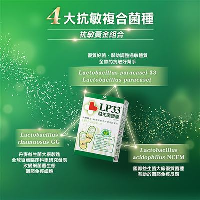 原料:LP33®菌粉Lactobacillus paracasei 33、葡萄糖、玉米澱粉、麥芽糊精、LGG菌粉Lactobacillus rhamnosus GG、副乾酪桿菌菌粉Lactobacillus paracasei subsp. paracasei、嗜酸乳桿菌NCFM菌粉Lactobacillus acidophilus NCFM、果寡醣、硬脂酸鎂。 膠囊成分:明膠、硫酸月桂酯鈉。 |