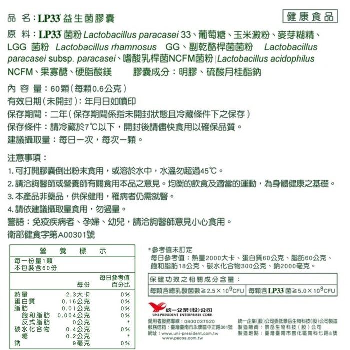 | 商品名稱 | 【統一LP33】健字號益生菌膠囊*2盒(60顆/盒) |
