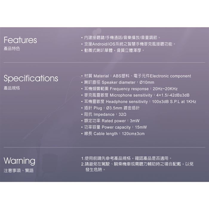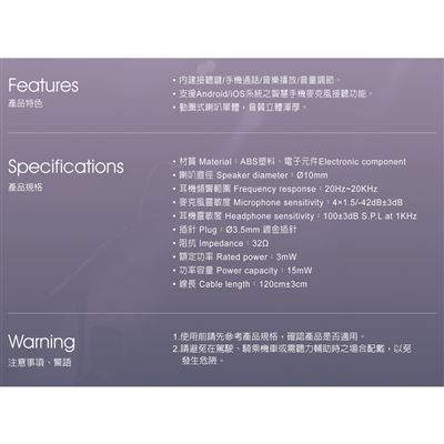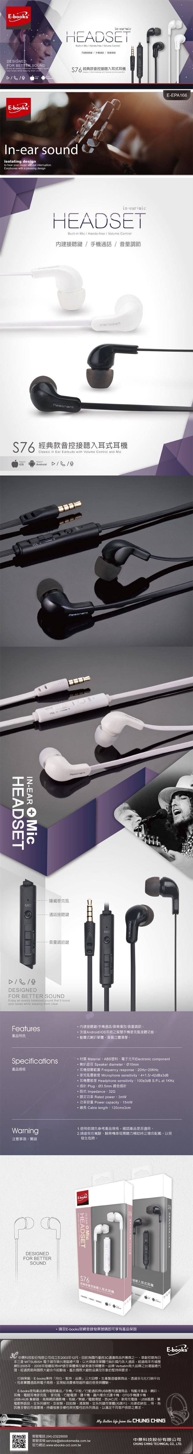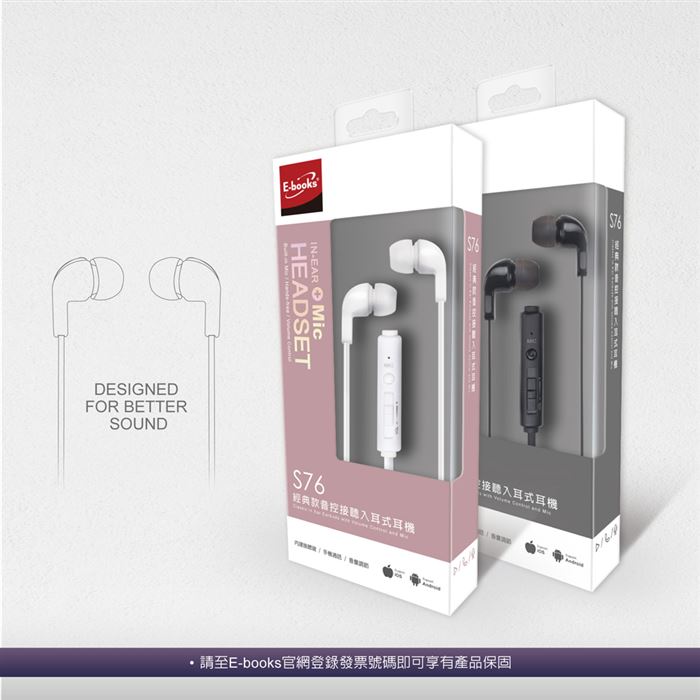 | 【包裝內容/規格】 | E-books S76 經典款音控接聽入耳式耳機 |