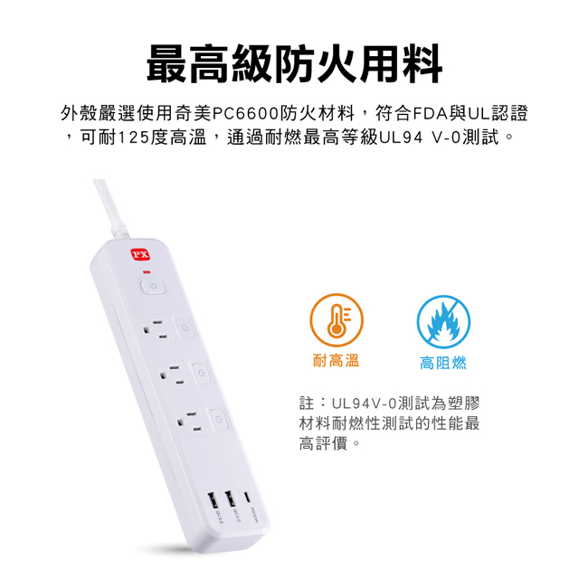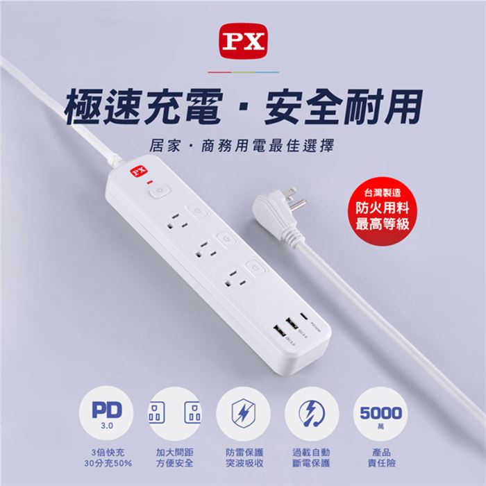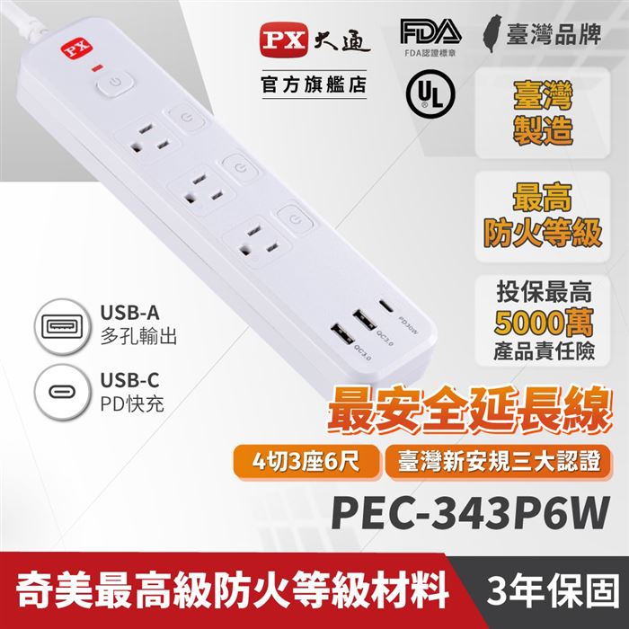 | 商品名稱 | 【PX大通】4切3座6尺+3USB電源延長線(1.8公尺) PEC-343P6W |
