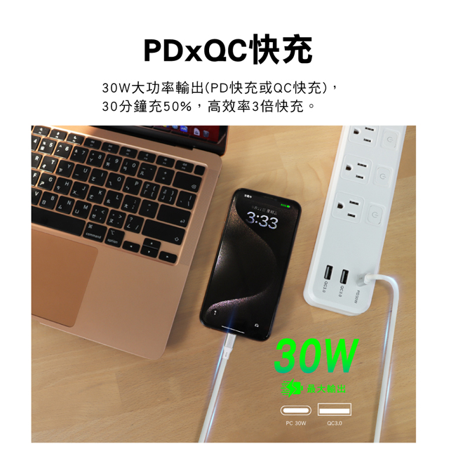 *30W大功率輸出(PD快充或QC快充),高效率3倍快充
