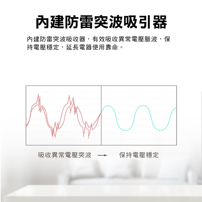 *內建防雷突波吸收器,有效吸收異常電壓脈波,保持電壓穩定,延長電器使用壽命