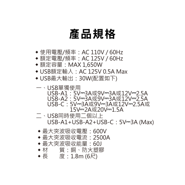 商品規格:4個切換開關、3個電源擴充座、3個USB充電座(USB-Ax2座+ USB-Cx1座)