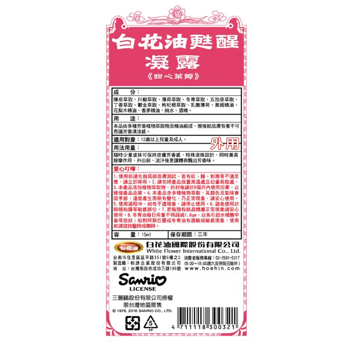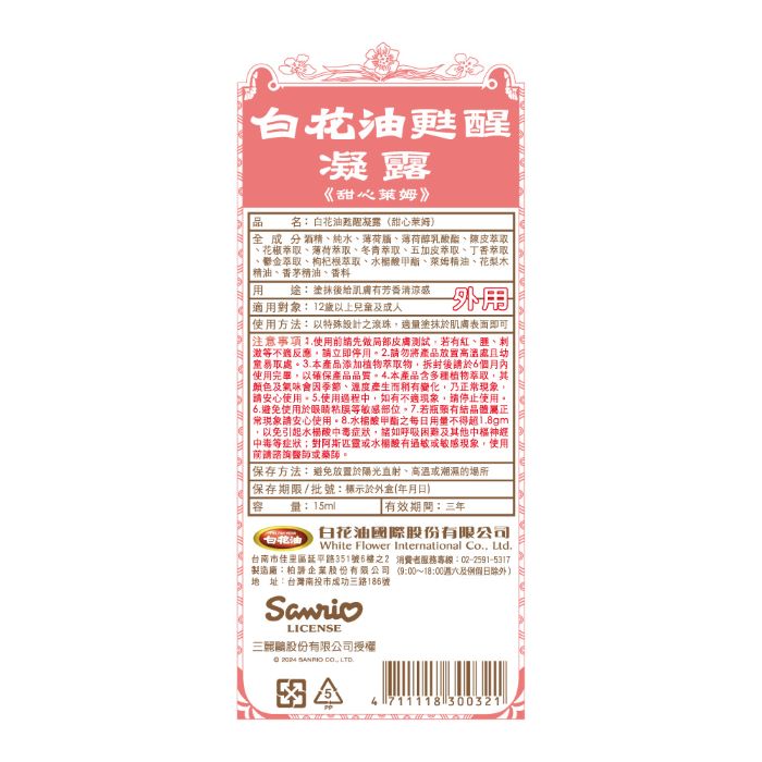 | 包裝內容/商品規格 | 白花油甦醒凝露(甜心萊姆)15ml /瓶,共1瓶。 |