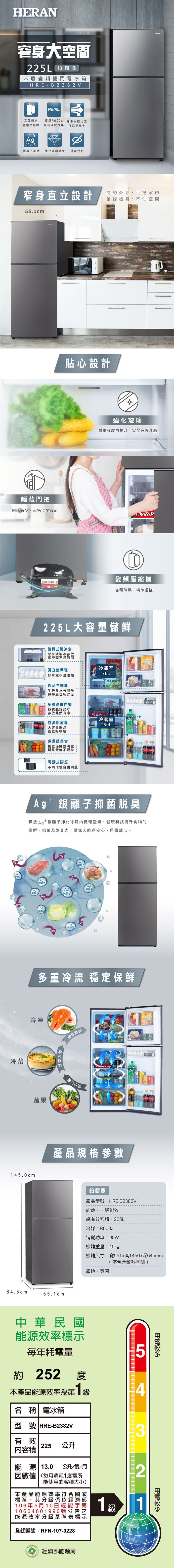 | 商品名稱 | 【HERAN禾聯】 225L變頻一級雙門窄身電冰箱 HRE-B2382V |