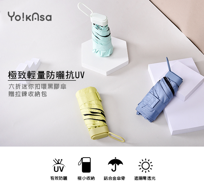 【Yo!kAsa】極致輕量防曬抗UV六折迷你扣環黑膠傘 贈拉鍊收納包