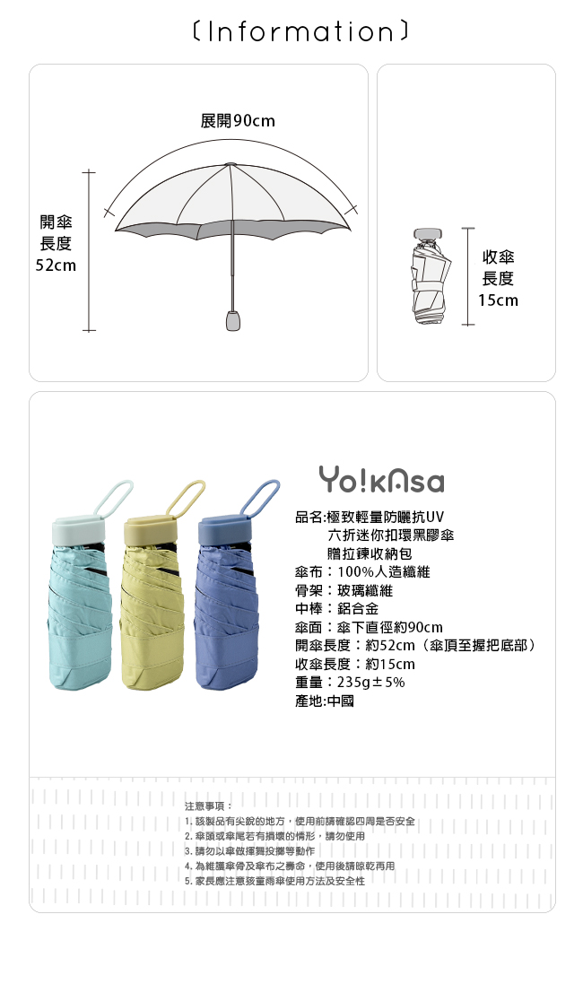 | 【尺寸】 | 開傘長度:約52cm(傘頂至握把底部)、收傘長度:約15cm |