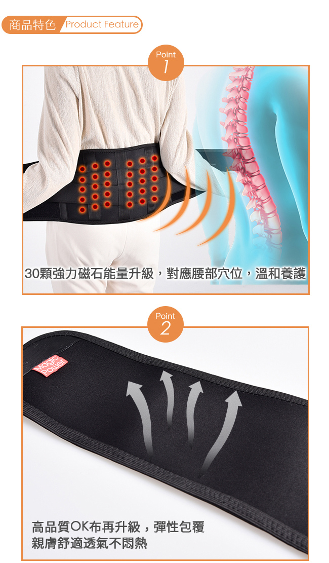 30顆強力磁石能量升級,對應腰部穴位,溫和養護