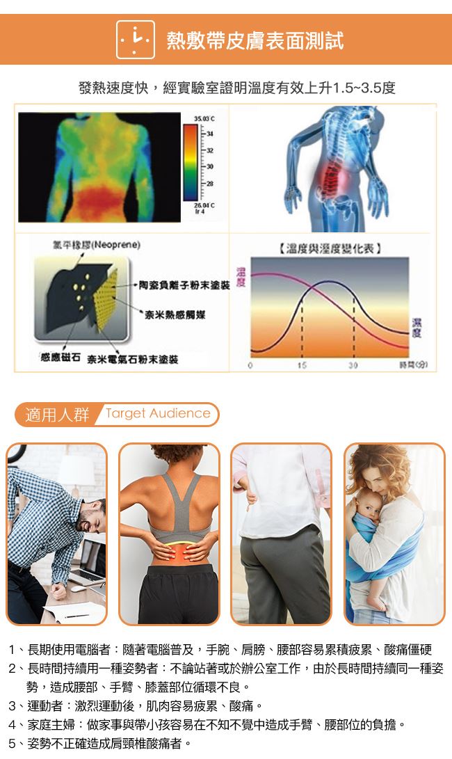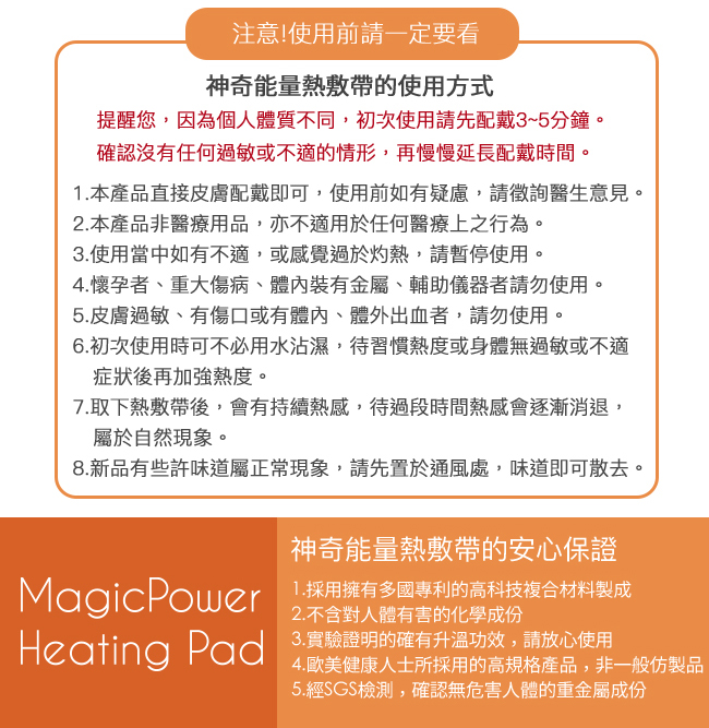 | 【注意事項或使用方法】 | 1.本產品直接皮膚配戴即可,使用前如有疑慮,請徵詢醫生意見。 2.本產品非醫療用品,亦不適用於任何醫療上之行為。 3.使用當中如有不適,或感覺過於灼熱,請暫停使用。 4.懷孕者、重大傷病、體內裝有金屬、輔助儀器者請勿使用。 5.皮膚過敏、有傷口或有體內、體外出血者,請勿使用。 6.初次使用時可不必用水沾濕,待習慣熱度或身體無過敏或不適症狀後再加強熱度。 7.取下熱敷帶後,會有持續熱感,待過段時間熱感會逐漸消退 ,屬於自然現象。 8.新品有些許味道屬正常現象,請先置於通風處,味道即可散去。 |