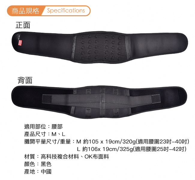 | 【尺寸】 | 產品尺寸:M、L 攤開平量尺寸/重量:M 約105 x 19cm/320g(適用腰圍23吋-40吋) L 約106x 19cm/325g(適用腰圍25吋-42吋) |