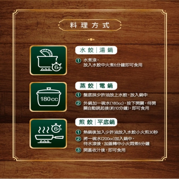 | 內容物(完整成份/食品添加物) | 麵粉、韭菜、水、豬肉(台灣)、高麗菜、豬絞油(台灣)、醬油、薑母、麻油、蒜、鹽、大豆沙拉油、黏稠劑(羥丙基磷酸二澱粉)、味素(L-麩酸鈉、5"-次黃嘌呤核苷磷酸二鈉、5"-鳥嘌呤核苷磷酸二鈉、二氧化矽)、調味料(鹽、L-麩酸鈉、葡萄糖、全蛋粉、胺基乙酸、DL-胺基丙酸、琥珀酸二鈉、二氧化矽、檸檬酸、酵母抽出物、維生素B1、香料、天然香料)、黏稠劑(關華豆膠)、調味粉(鹽、麥芽糊精、L-麩酸鈉、糖、雞肉抽出物、5"-次黃嘌呤核苷磷酸二鈉、5"-鳥嘌呤核苷磷酸二鈉、胺基乙酸、DL-胺基丙酸、醬油、豬肉抽出物、洋蔥粉、二氧化矽、丁香粉、肉桂粉、甘草粉、草果粉、八角粉、白荳蔻粉、川芎粉、小茴香粉、檸檬酸、桂皮粉、白胡椒粉、香料)、小麥蛋白、白胡椒粉 |