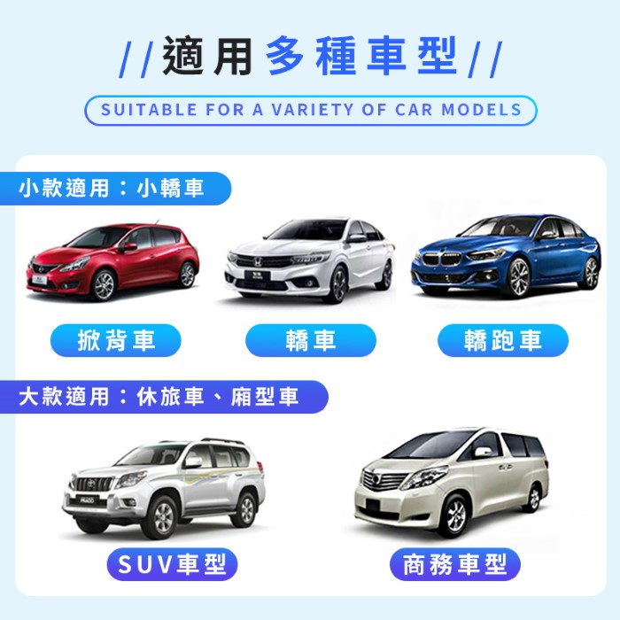 | 【適用車型】 | 小款 - 掀背車、轎車、轎跑車 大款 - SUV車型、商務車型 |