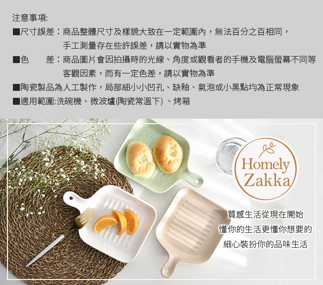 尺寸誤差:商品整體尺寸及樣貌大致在一定範圍內,無法百分之百相同,手工測量存在些許誤差,請以實物為準 色差:商品圖片會因拍攝時的光線、角度或觀看者的手機及電腦螢幕不同等客觀因素,而有一定色差,請以實物為準 陶瓷製品為人工製作,局部細小小凹孔、缺釉、氣泡或小黑點均為正常現象 適用範圍:洗碗機、微波爐(陶瓷常溫下) 、烤箱 |