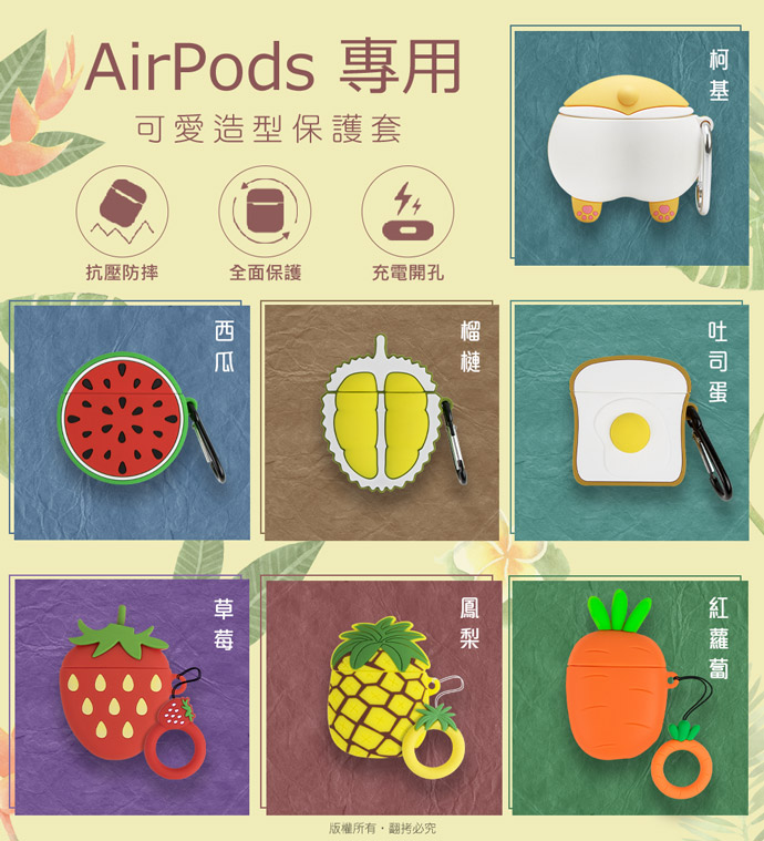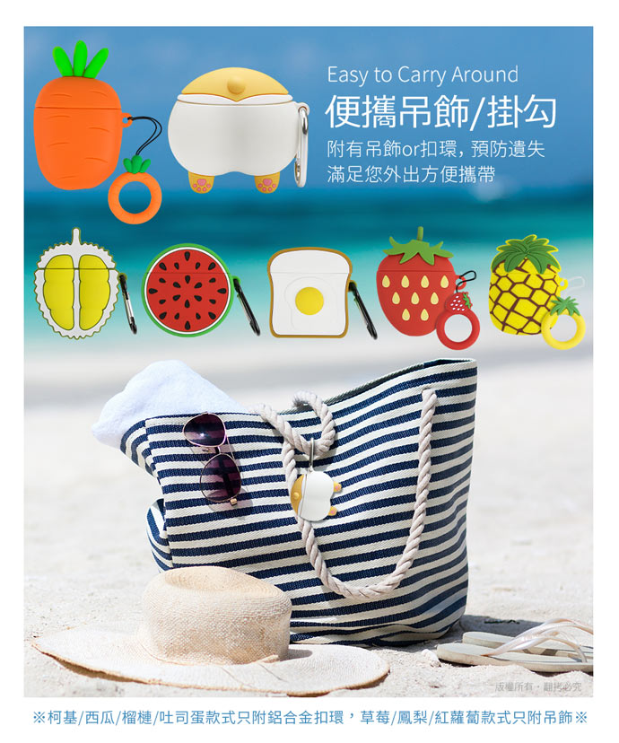 | 內容物 | 矽膠保護套(上套+下套) x1、掛飾 x1(草莓、鳳梨、紅蘿蔔) 或 鋁合金扣環(柯基、西瓜、榴槤、吐司蛋 ) |