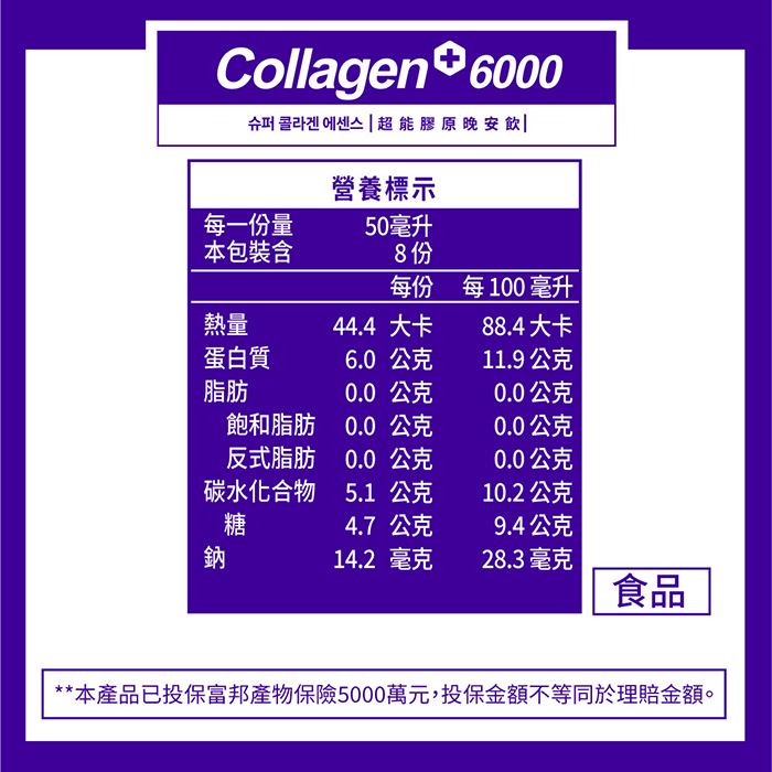 | 內容物(完整成份/食品添加物) | 水、魚膠原蛋白、紅葡萄濃縮汁、蘋果濃縮汁、蔓越莓濃縮汁、麩胺酸發酵物(含GABA)(麩胺酸發酵物、氧化澱粉)、檸檬酸、蠶絲蛋白(蠶絲蛋白、樹薯糊精)、石榴萃取物(石榴萃取物、麥芽糊精)、葡萄籽萃取物(含前花青素)、葡萄萃取物(含白藜蘆醇)、血橙萃取物(血橙萃取、麥芽糊精)、昭和草萃取物(昭和草萃取、糊精)、茶胺酸、維生素C、蒟蒻粉、玄米萃取物(含神經醯胺)(玉米糊精、米抽出物)等詳見包裝 |