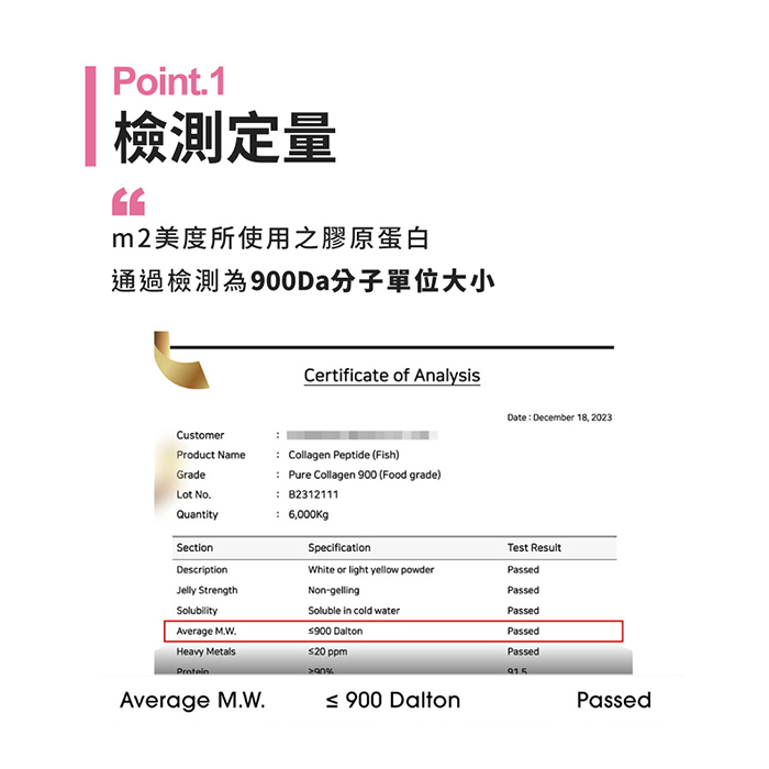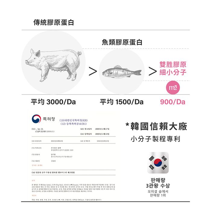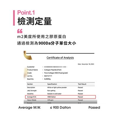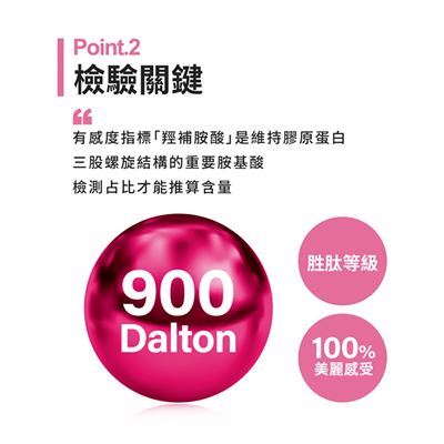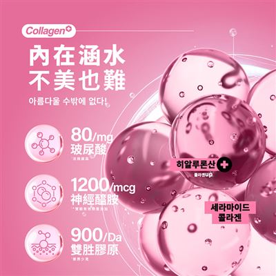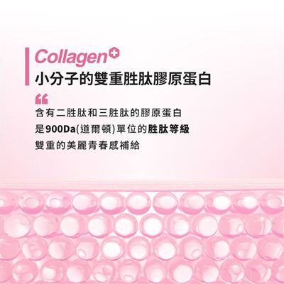 | 內容物(完整成份/食品添加物) | 水、魚膠原蛋白、蜜桃濃縮汁、蘋果濃縮汁、流行鏈球菌發酵物(含透明質酸鈉)、檸檬酸、 DL-蘋果酸、蠶絲蛋白(蠶絲蛋白、樹薯糊精)、葡萄萃取物(含白藜蘆醇)、維生素 C、蒟蒻粉、玄米萃取物(含神經醯胺)(玉米糊精、米抽出物)、石榴萃取物(石榴萃取物、麥 芽糊精)、番茄萃取物、酵母濃縮粉(含硅素)、鮭魚抽出物(麥芽糊精、鮭魚抽出物) |