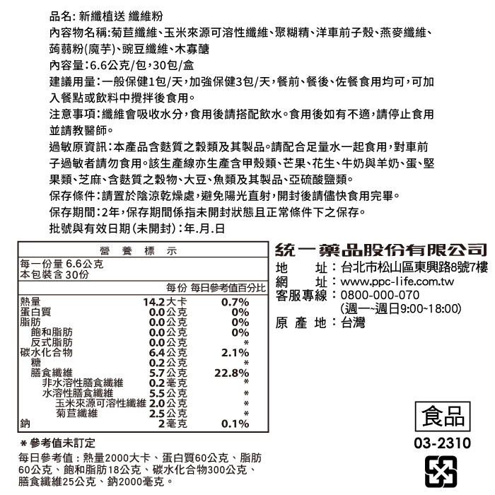 | 內容物 (完整成份) | 菊苣纖維、玉米來源可溶性纖維、聚糊精、洋車前子殼、燕麥纖維、蒟蒻粉(魔芋)、豌豆纖維、木寡醣。 |