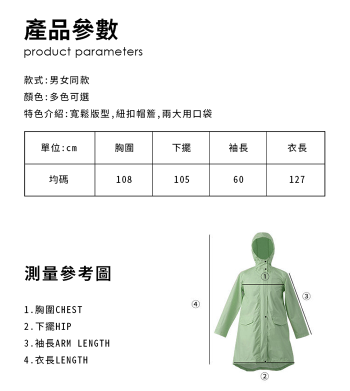 | 【注意事項或使用方法】 | ※產品尺寸為手工測量會有些許誤差,依實物為準。 ※產品因環境光線、相機參數、螢幕發色的不同,可能有些許誤差,請依實物為準,顏 色尺寸難免會有些許色差或公差,如無法接受請勿下單 ※尺寸表可供參考雨衣長度,購買前請先參考再評估是否合適 |