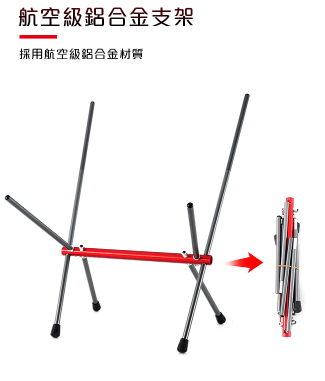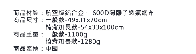 | 【材質或成分】 | 航空級鋁合金,600D陽離子透氣網布 |