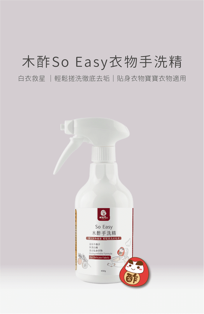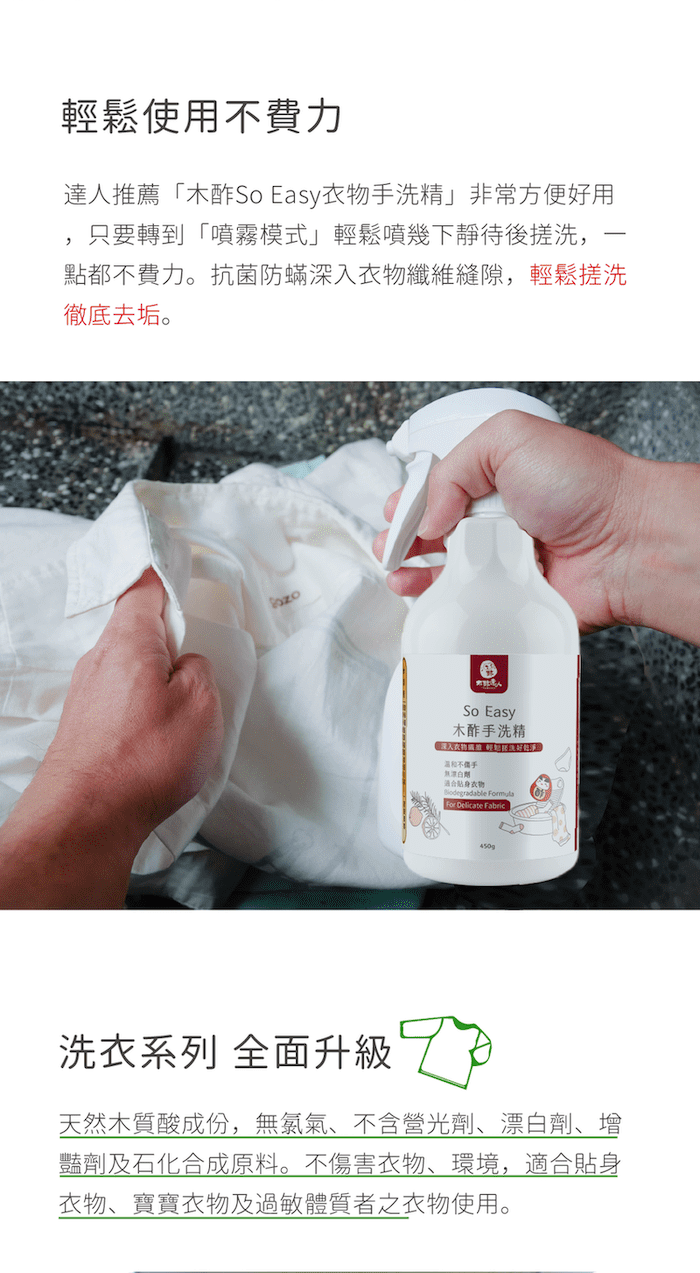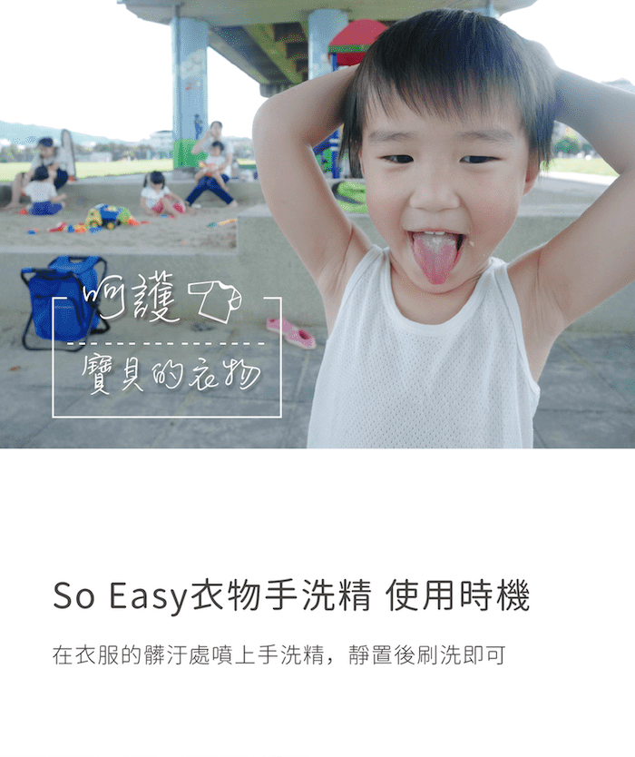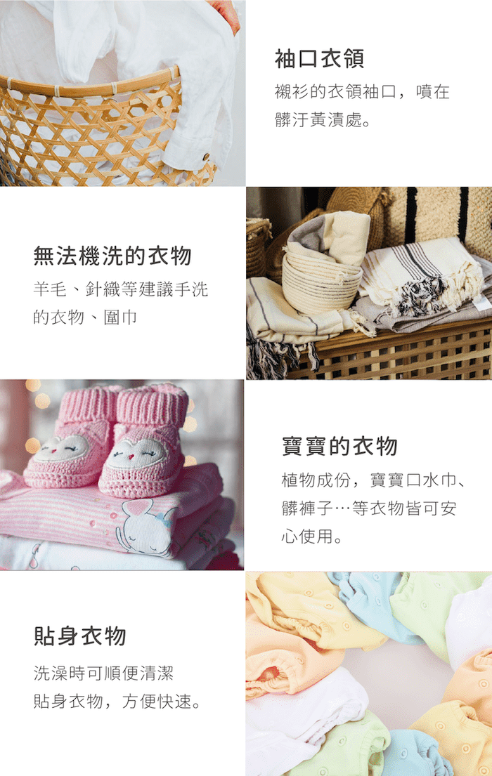 將欲洗滌的衣物浸水打濕後,按壓1~2下手洗精至髒污處,用手搓洗後,再用清水洗淨即可。
