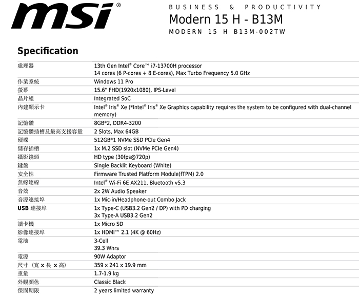 MSI微星 Modern 15 H B13M-002TW 15吋效能筆電(i7-13700H/16G/512G SSD/Win11Pro)