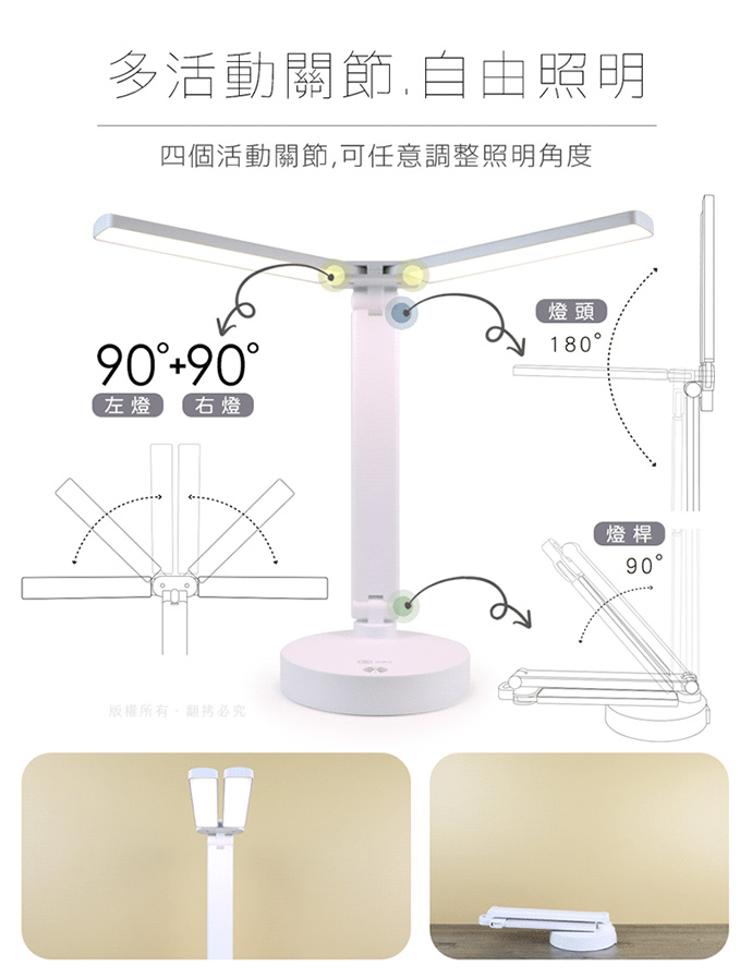特殊LED雙頭設計,左右燈皆可90°開闔,加大照明範圍。