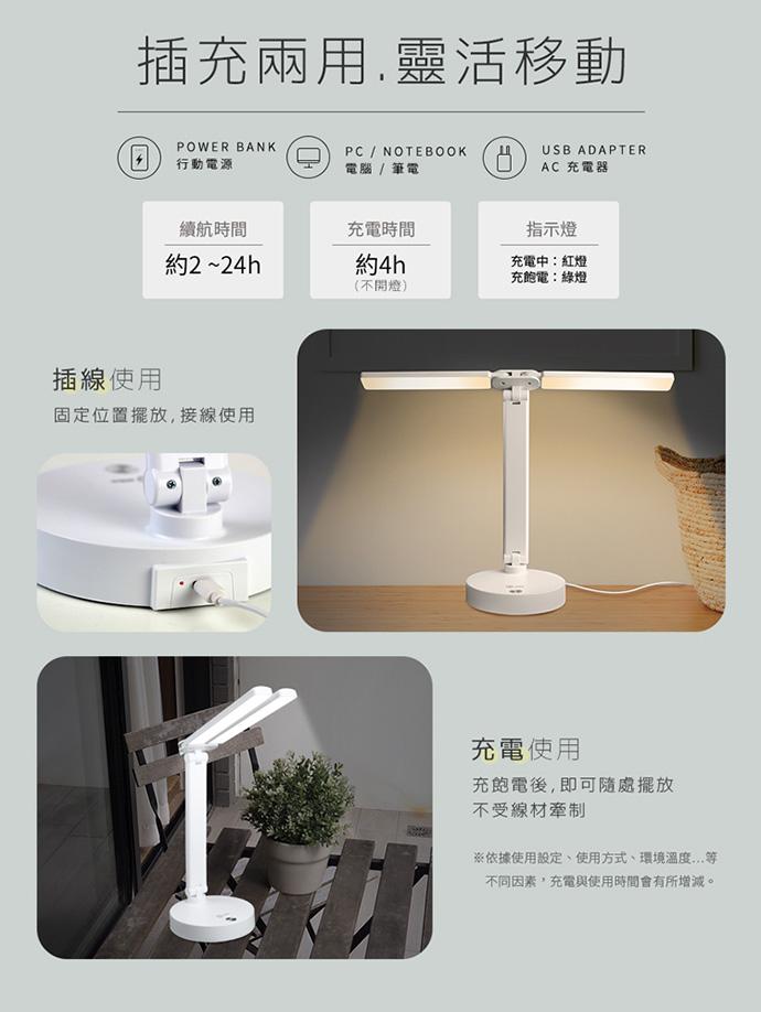 .充電時間和使用時間僅供參考,實際使用會依個人充電設備/環境溫度/使用設定…等
