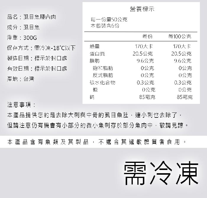 | 內容物(完整成份/食品添加物) | 虱目魚柳 |