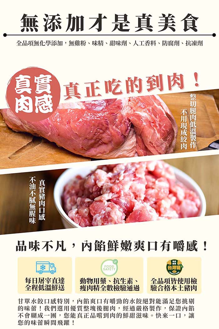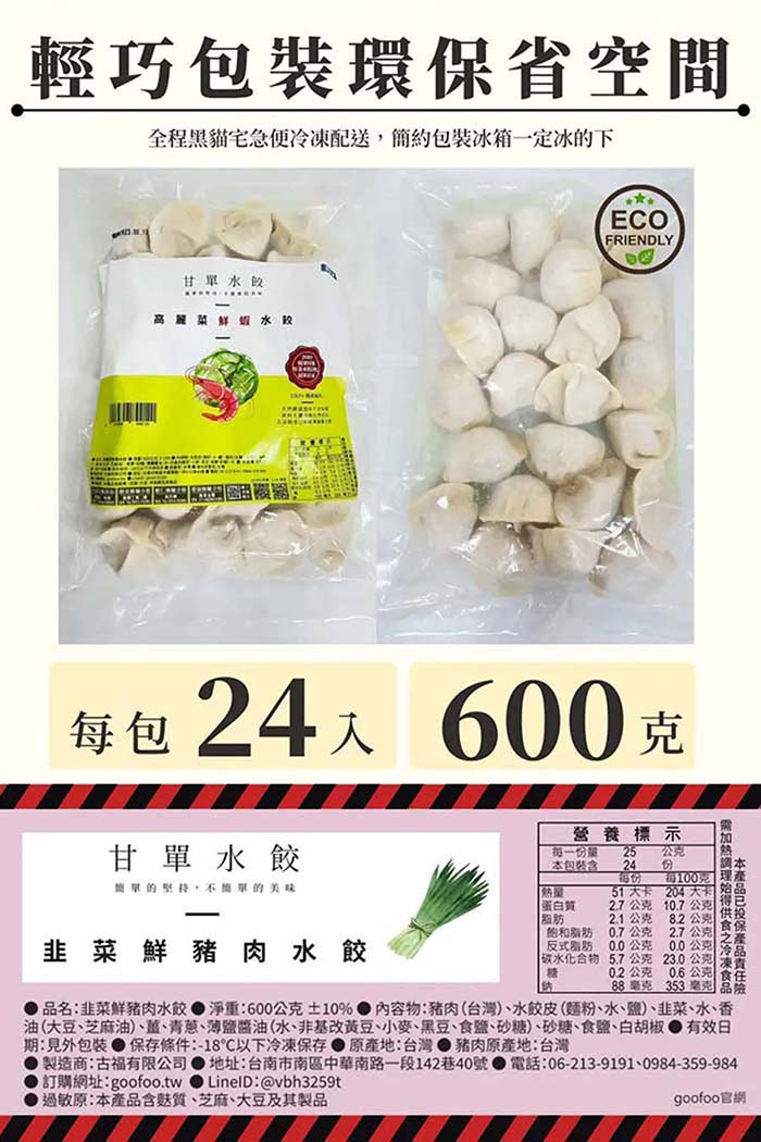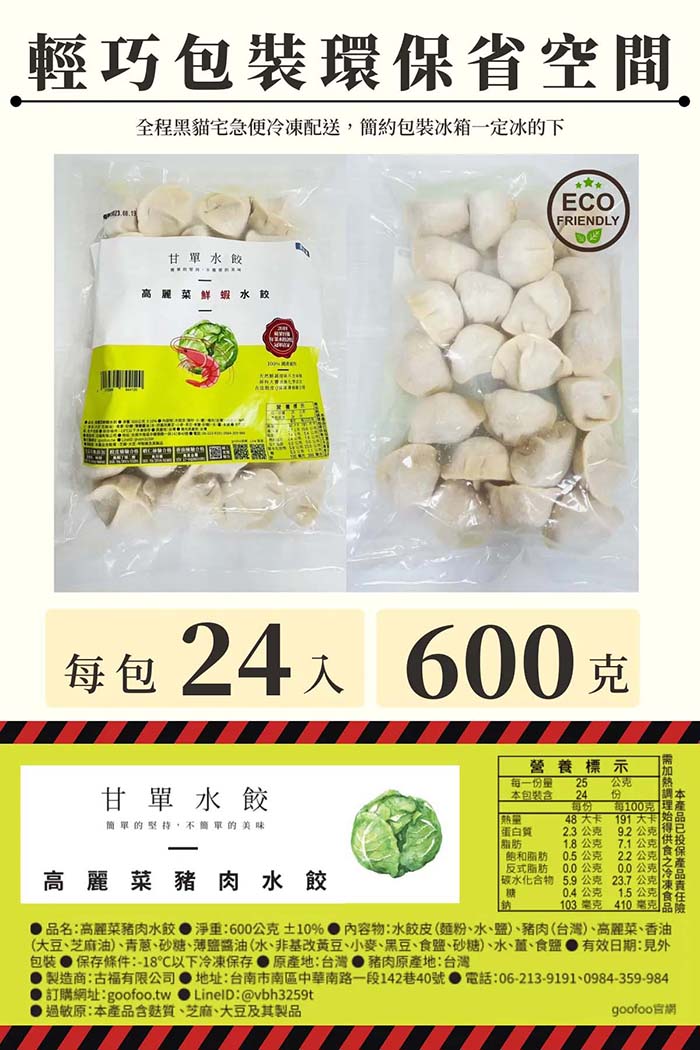 | 商品名稱 | 【甘單】豬肉水餃(高麗菜&韭菜)(600g/24顆)_6包組 |