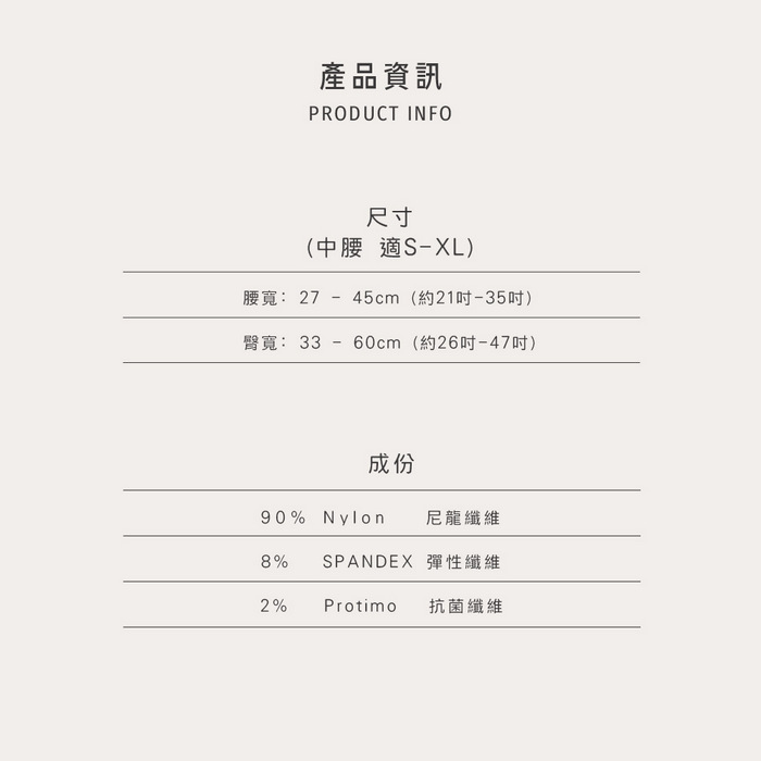 | 【材質或成分】 | 90% Nylon8% Spandex2% Protimo (Antibacterial Fiber) |