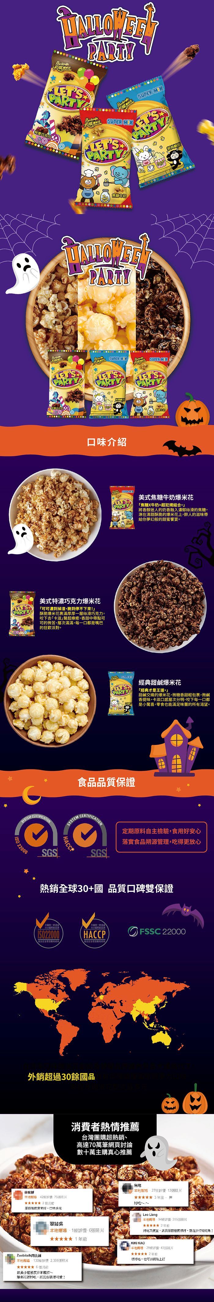 | 包裝內容/商品規格 | 美式焦糖牛奶爆米花隨手包12g*10包、特濃巧克力爆米花隨手包12g*10包、經典鹹甜爆米花隨手包12g*10包 |