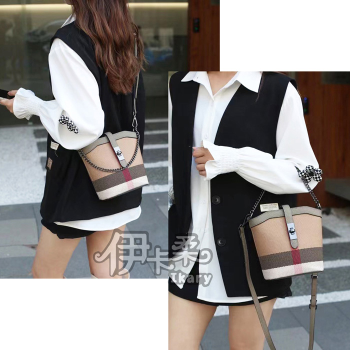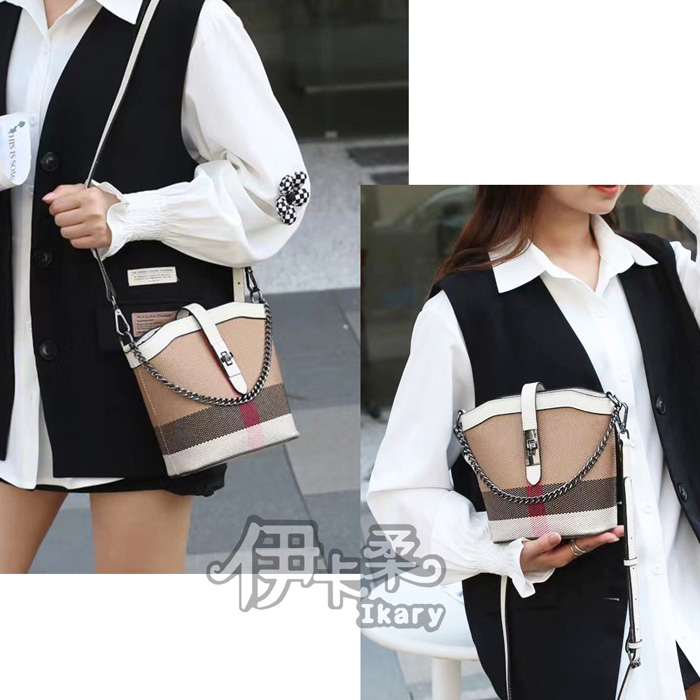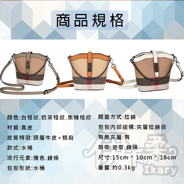| 【商品名稱】 | 【Ikary 伊卡柔】真牛皮經典格紋撞色水桶包8367(手提/斜背)-米白 |