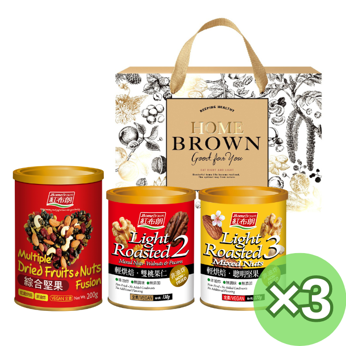| 包裝內容/商品規格 | 【紅布朗】精選堅果禮盒(綜合堅果200g+輕烘焙聰明堅果170g+輕烘焙雙桃果仁130g)X3盒組 |