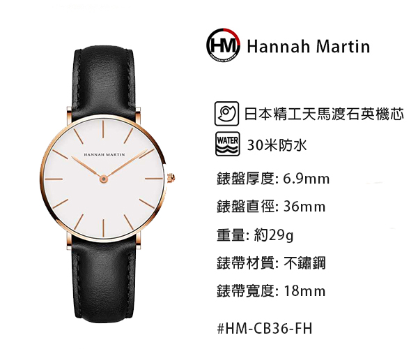 | 商品名稱 | HANNAH MARTIN金色刻度設計感腕錶-白面黑皮帶 HM-CB36-FH |