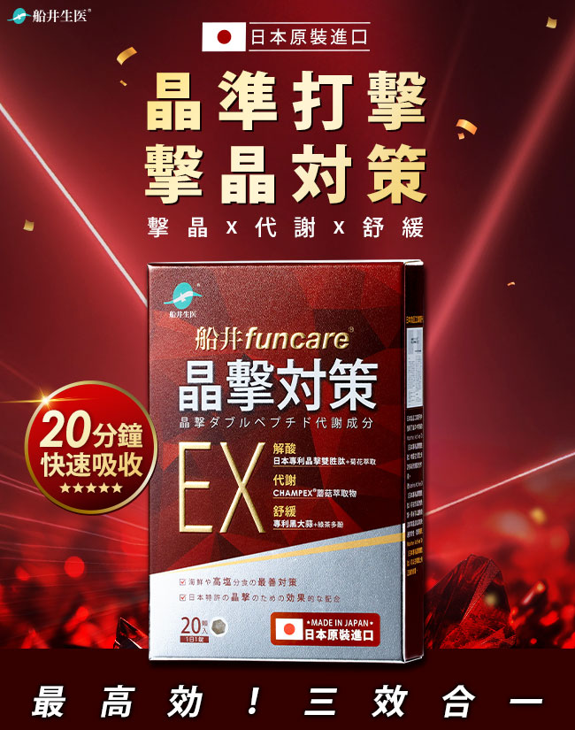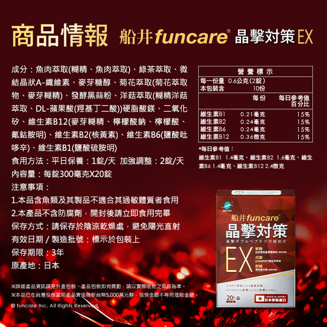 | 包裝內容/商品規格 | 船井funcare晶撃對策EX代謝錠20顆入*3盒 |