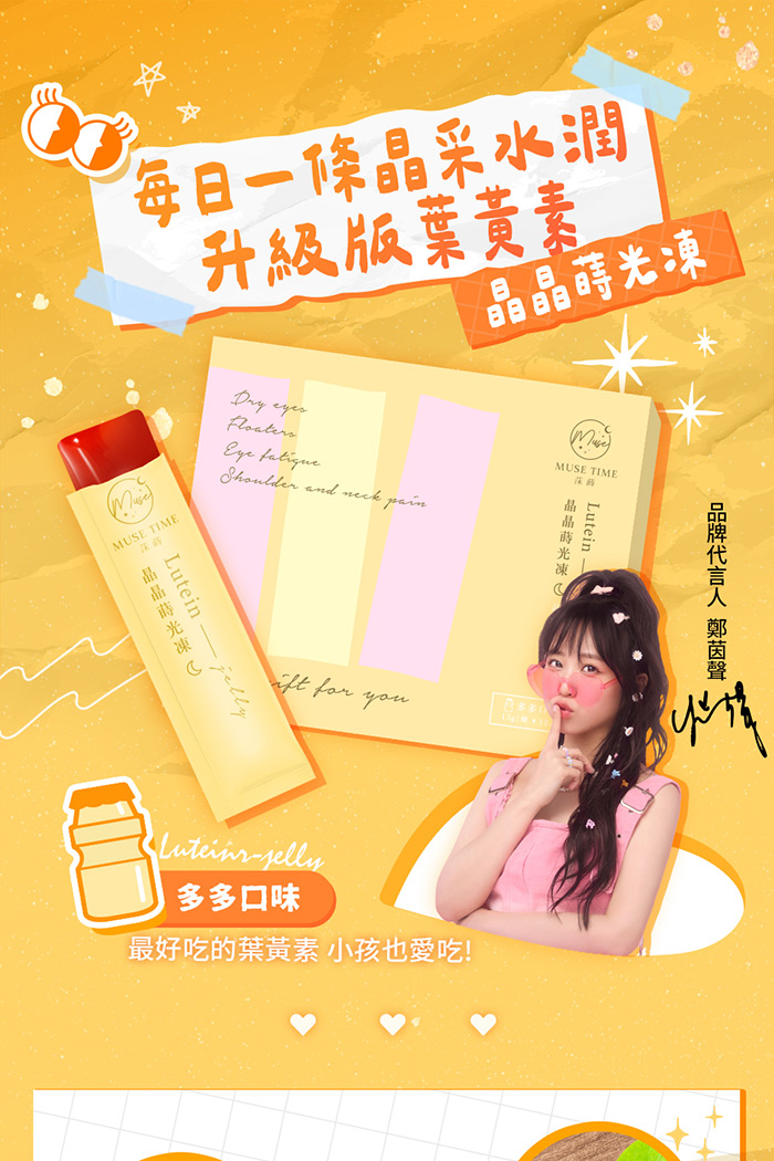 含葉黃素、山桑子萃取 — 超保護、超保濕、超舒適 守護3C低頭族、備考學生族、長時間用眼族的最佳亮晶晶幫手 - 晶晶蒔光凍。每天一條晶晶蒔光凍,抗光保護、減緩疲乏感、保濕滋潤