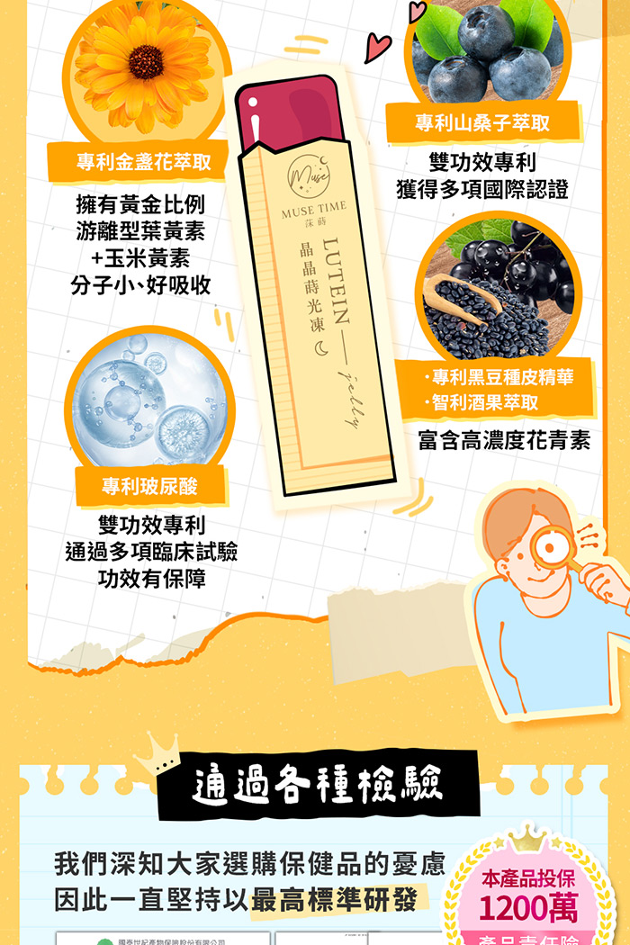 | 內容物 (完整成份/食品添加物) | 專利山桑子萃取、專利流行鏈球菌發酵物(含玻尿酸)、專利金盞花萃取(含葉黃素、玉米黃素)、小米草萃取、專利黑豆皮精華、智利酒果萃取、乳酸菌發酵乳 |