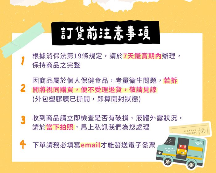 ● 瑕疵商品:在您收到商品後七日內發現商品有破損或贈品缺漏的情況,請立刻與我們聯繫,以便我們重新將新品補送到您的手上,並將您手上有瑕疵或損壞的產品交由快遞收回。