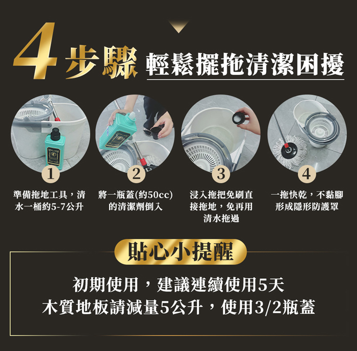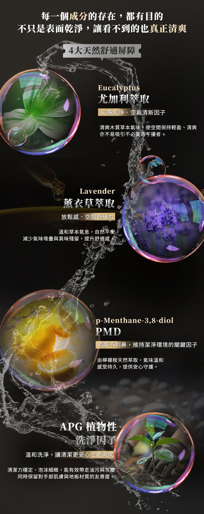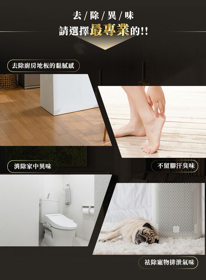 | 用途 | 適用各種磁磚、大理石、花崗岩、木質、塑膠等硬質地板。徹底清潔及去除地板油脂髒污、改善異味並抑菌。清潔後留下淡淡植物香氣,免清水二次清潔,中性溫和無負擔,踩踏清爽不黏膩。 |