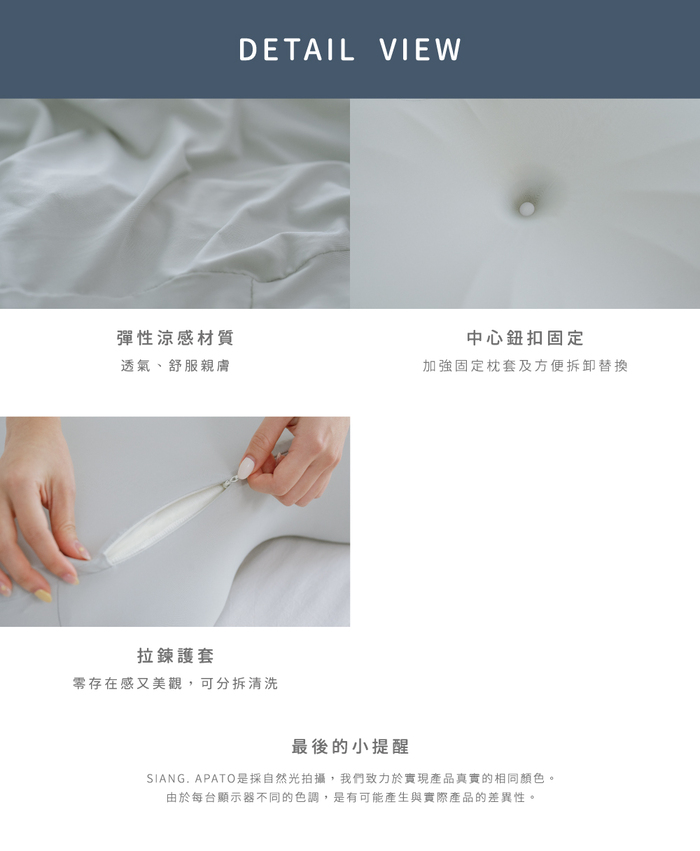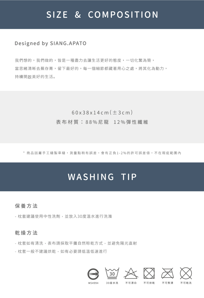 | 保存方法 | -枕套建議使用中性洗劑,並放入30度溫水進行洗滌 -枕套如有清洗,表布請採取平攤自然晾乾方式,並避免陽光直射 -枕套一般不建議烘乾,如有必要請低溫低速進行 |