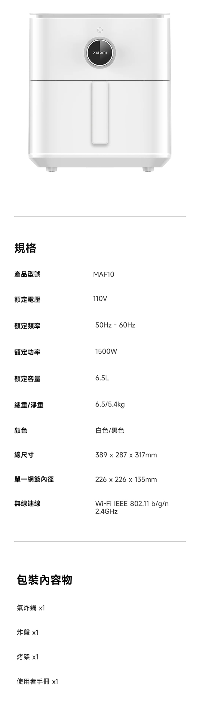 | 商品名稱 | Xiaomi 智慧氣炸鍋 6.5L |