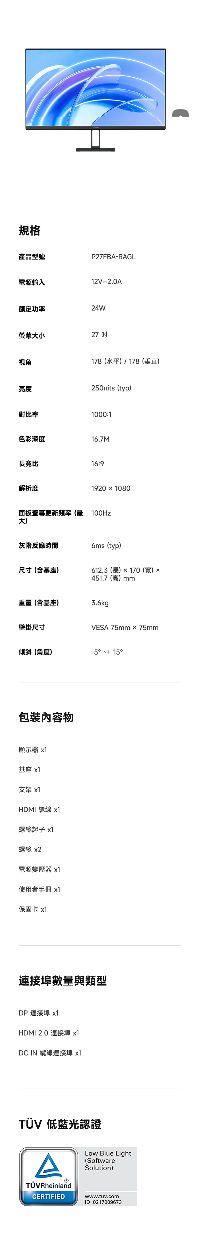27吋/IPS/100Hz/P27FBA-RAGL