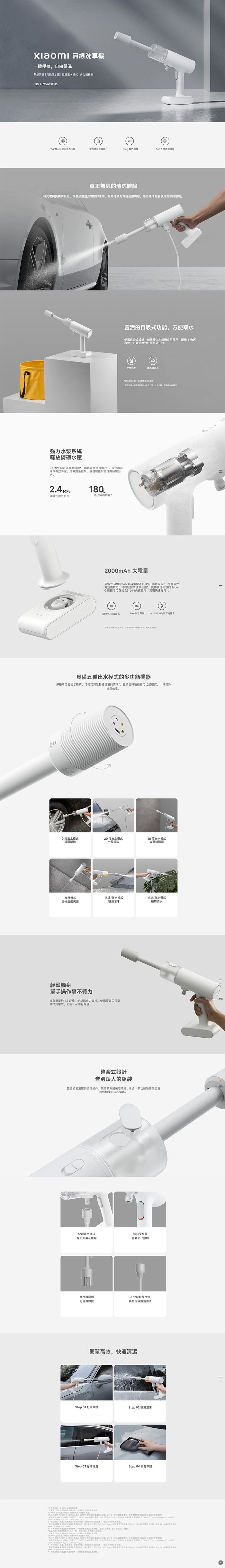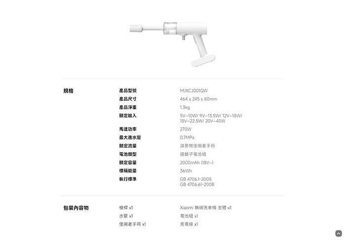 | 【內容物】 | 槍桿 x1 Xiaomi 無線洗車機 主體 x1 水管 x1 電池組 x1 使用者手冊 x1 充電線 x1 |