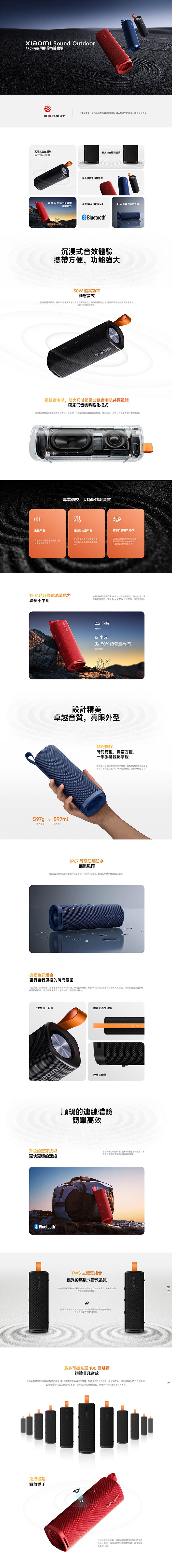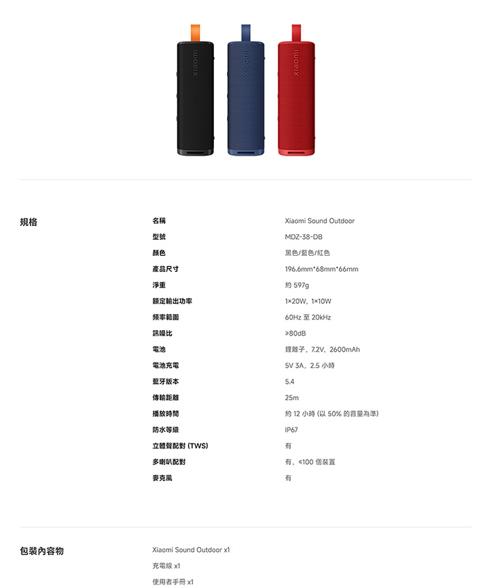 | 內容物 | Xiaomi Sound Outdoor x1 充電線 x1 使用者手冊 x1 |