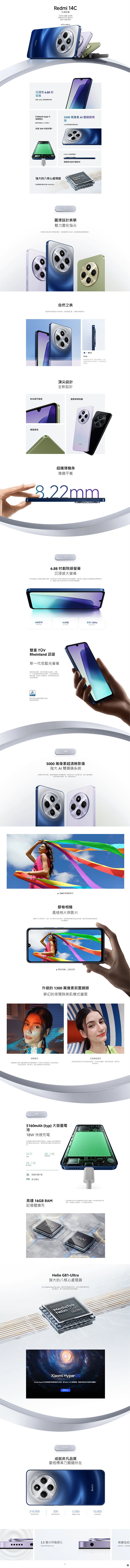 | 內容物 | Redmi 14C / USB Type-C 數據線 / 快速入門指南與保固卡 / SIM 卡插針 / 安全資訊 |